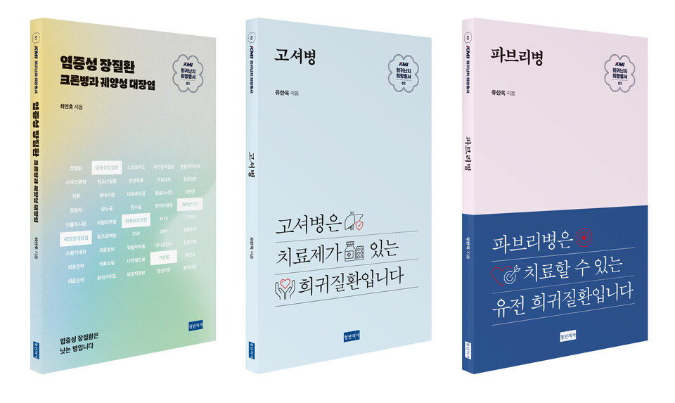 이번에 출간된 3권은 ▲염증성 장질환(크론병과 궤양성 대장염) ▲고셔병 ▲파브리병이며 앞으로는 혈우병, 척수성 근위축중(Spinal Muscular Atrophy, SMA), 신경섬유종증 1형, 중증복합면역결핍증, 뇌전증, 다발 골수종, 중증근무력증, 림프종 등에 대한 단행본도 나올 예정이다. 여러 희귀난치성 질환 중에서도 환자가 '비교적' 많고 표준 치료법이 존재하며 의료·사회적 지원 가능성이 있는 질환들을 우선 선정했다. 이번 프로젝트는 청년의사 출판사업부가 기획·편집을 맡고, KMI가 후원했다.