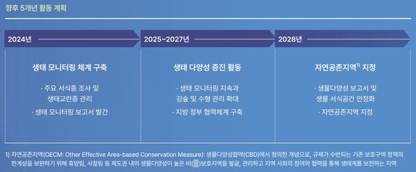 유한양행은 5개년 계획을 통해 2027년까지 모니터링과 서식지 관리 범위를 확대하고, 지자체와의 유기적 협력을 통해 2028년에는 미호강 일대를 “자연공존지역”으로 지정하는 것을 목표로 하고 있다.