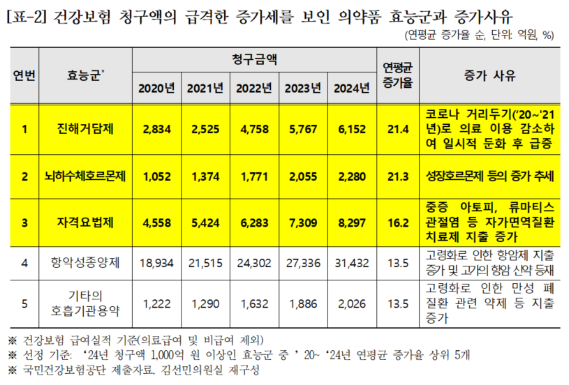 그 다음으로 뇌하수체호르몬제가 연평균 21.3% 증가해 뒤를 이었다. 성장호르몬제 사용 증가가 원인으로 꼽혔다. 세 번째로 많이 증가한 효능군은 자격요법제로 중증아토피, 류마티스 관절염 등 자가면역질환 치료제 지출 증가가 영향을 미쳤다. 연평균 증가율은 16.2%였다.