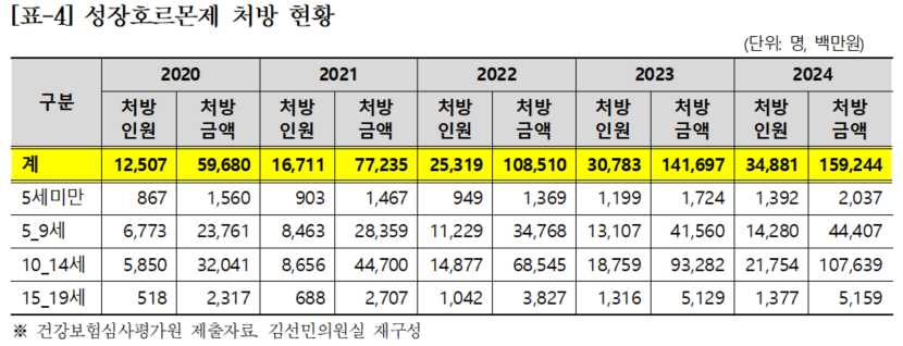 성장호르몬제의 경우 2020년 1만2,507명이었던 19세 이하 처방인원이 지난해 3만4,811명으로 5년 만에 약 3배 급증했고, 청구금액도 2020년 596억원에서 2024년 1,592억원으로 2.5배 이상 늘었다. 연령대별로 살펴봐도 19세 이하 전 연령에서 급증한 것으로 확인됐다.