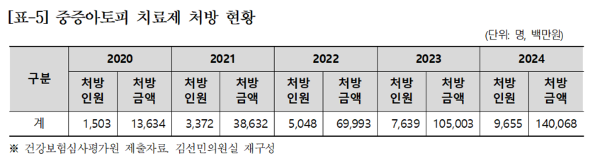 중증아토피치료제도 같은 기간 1,503이었던 처방인원이 2024년 9,655명으로 5년만에 약 6배 급증했다. 청구금액도 같은 기간 136억원에서 1,400억원으로 약 10배 증가했다.