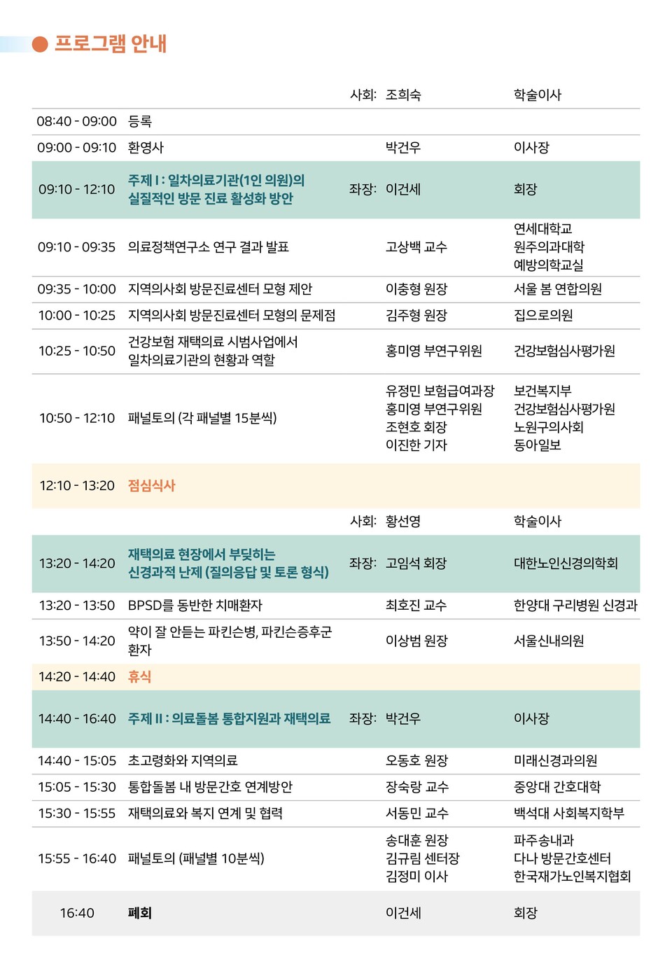패널 토의에서는 파주 연세송내과 송대훈 원장, 다나방문간호센터 김규림 센터장, 한국재가협회 김정미 사회복지사가 참여해 현장 목소리를 전달할 예정이다. 이 세션은 박건우 이사장이 좌장을 맡는다.