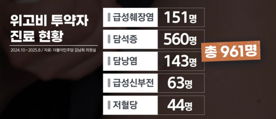 위고비 투약 후 중증 부작용으로 병원에서 치료 받은 내역을 파악한 결과, 급성췌장염을 겪은 환자는 151명, 담석증 560명, 담낭염 143명, 급성신부전 63명, 저혈당 44명 등 961명이었다.