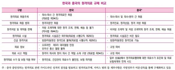 연구원은 "중국과 한국의 원격의료 관련 규제의 근본적인 차이는 의사-환자간 원격의료 금지로, 이로 인해 한국은 원격진료 및 원격처방전, 원격조제·판매 등 관련 서비스 전반이 발전하지 못하고 있다"고 했다.