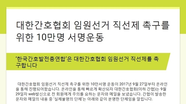 한국간호발전총연합은 지난달 27일부터 온라인을 통해 ‘대한간호협회 임원선거 직선제 촉구를 위한 10만명 서명운동’을 벌이고 있으며, 참여자가 지난 9일 1만4,647명을 넘어섰다.