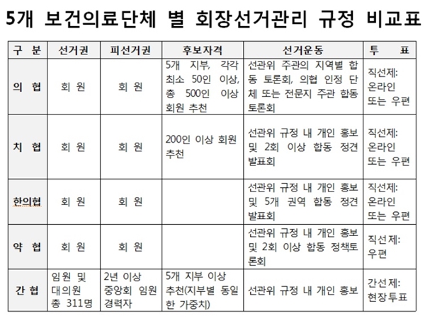 이들은 5개 보건의료단체 별 회장선거관리 규정 비교표를 게시하며 회장선거 간선제의 불합리함을 피력했다.