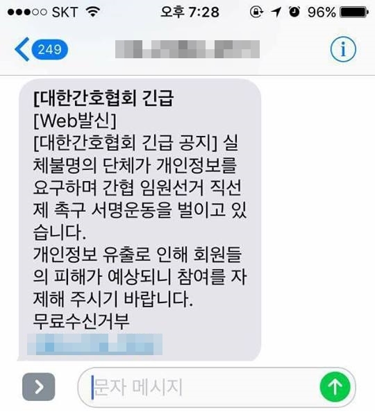 간협은 서명운동 시작 직후 “실체불명의 단체가 개인정보를 요구하며 간협 임원선거 직선제 촉구 서명운동을 벌이고 있다”면서 “개인정보 유출로 인해 회원들의 피해가 예상되니 참여를 자제해 달라”고 회원들에게 문자를 발송했다.