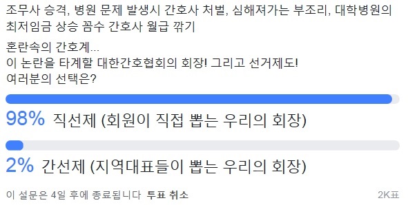 간호사 커뮤니티 투표 결과, 98%가 직선제 원해…“회원이 직접 뽑는 우리의 회장”