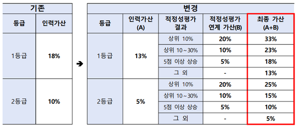 인력 가산 축소는 기존 1~2등급 가산율에서 각각 5%p씩 인하하는데, 이에 따라 1등급 가산율은 18%에서 13%로, 2등급 가산은 10%에서 5%로 낮아진다.