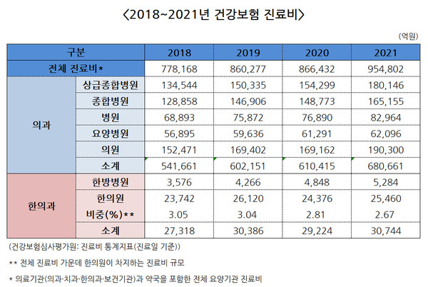 꾸준한 증가세를 보이던 의과 의료기관도 지난 2020년은 코로나19 확산으로 주춤하며 전년 대비 1.37%(61억415억원) 증가에 그쳤지만, 지난해 다시 11.51% 늘어 진료비는 68조661억원에 달했다.