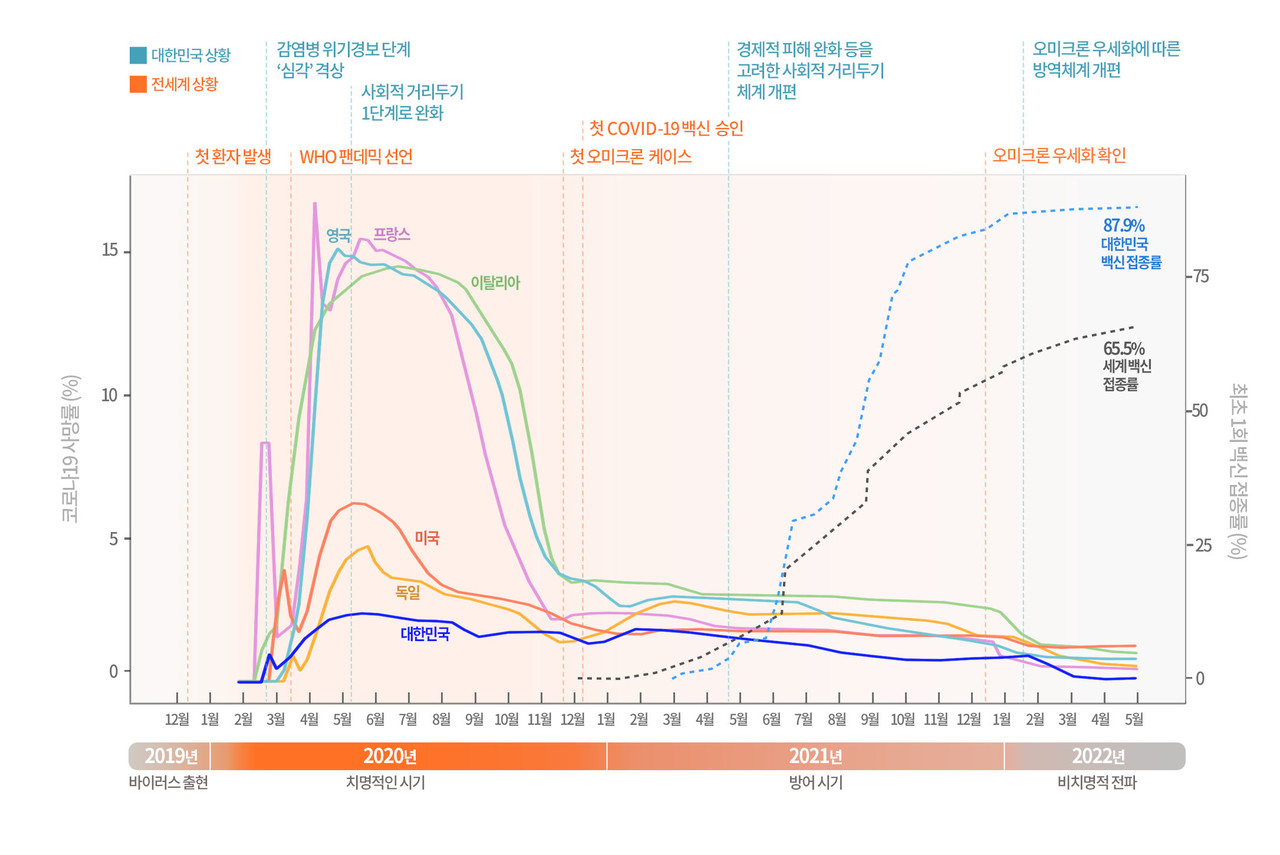 선제 대응과 백신 접종 등을 앞세운 한국 코로나19 대응 전략이 전 세계 최저 수준 사망률이라는 수치로 드러났다는 평가가 나왔다.