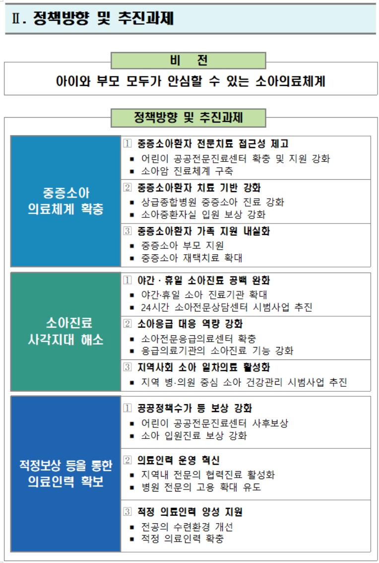 대책은 크게 ▲중증소아 의료체계 확충 ▲소아진료 사각지대 해소 ▲적정보상 등을 통한 의료인력 확보 등으로 구성됐다.