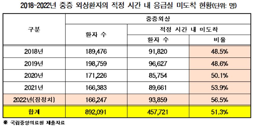 특히 중증외상환자의 경우 적정 시간 내 응급실 미도착 비율이 2018년 48.5%에서 2022년 56.5%로 약 8%p 늘었다.