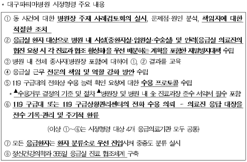 복지부는 이번 사건의 대응 과정에서 대구 지역의 다양한 응급의료 주체 간 연계‧협력이 매끄럽게 작동하지 못했던 것으로 파악하고 대구광역시에 대해서도 지방자치법에 따라 제도 개선을 권고했다.