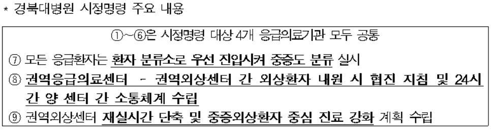 이밖에도 이후 대구 119구급상황관리센터에서 2회에 걸쳐 경북대병원 권역외상센터에 전화를 걸어 환자 수용을 의뢰했을 때 센터는 2번 모두 ‘다른 외상환자 진료 및 병상 부족’을 이유로 미수용했으나 전문가들은 가용 병상이 있었으며 진료 중이었던 다른 환자들 중 상당수가 경증환자였던 것으로 평가했다.