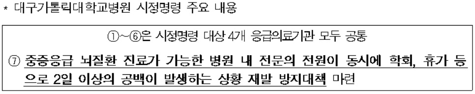 또한 구급대원이 응급실에 전화를 걸어 환자 수용을 의뢰했으나 ‘신경외과 의료진 부재’를 이유로 미수용한 대구가톨릭대병원(지역응급의료센터) 역시 같은 이유로 의료법 위반으로 지적됐으며 계명대 동산병원과 같은 처분을 받았다.