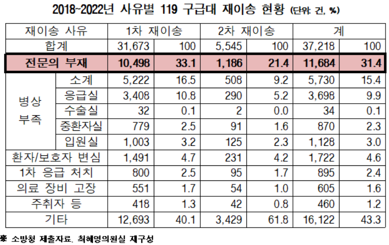 사유별 재이송 현황을 살펴보면 전문의 부재가 1만1,684건(31.4%)으로 가장 많았으며, 병상 부족이 5,730건(15.4%)으로 그 뒤를 이었다.