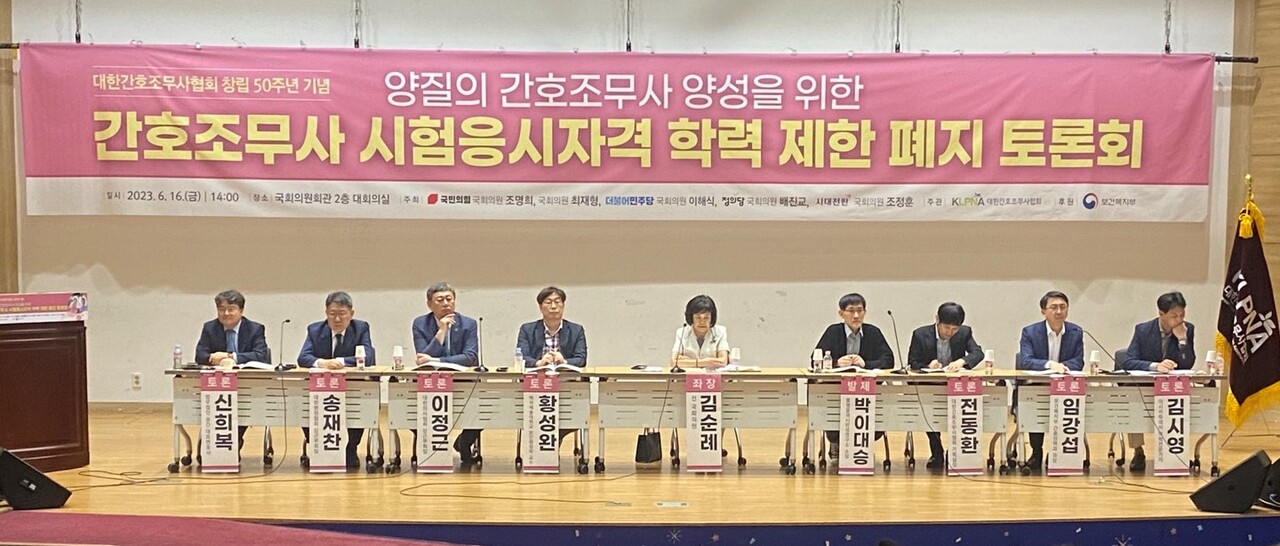 국민의힘 조명희‧최재형 의원, 더불어민주당 이해식 의원, 정의당 배진교 의원, 시대전환 조정훈 의원과 대한간호조무사협회는 지난 16일 오후 국회에서 ‘간호조무사 시험응시자격 학력 제한 폐지 토론회’를 개최했다. 이 자리에는 국민의힘 국회의원 다수가 얼굴을 비추며 힘을 실어주는 모습을 보였고, 윤재옥 원내대표는 축사를 통해 21대 국회 내 의료법 개정을 약속했다.