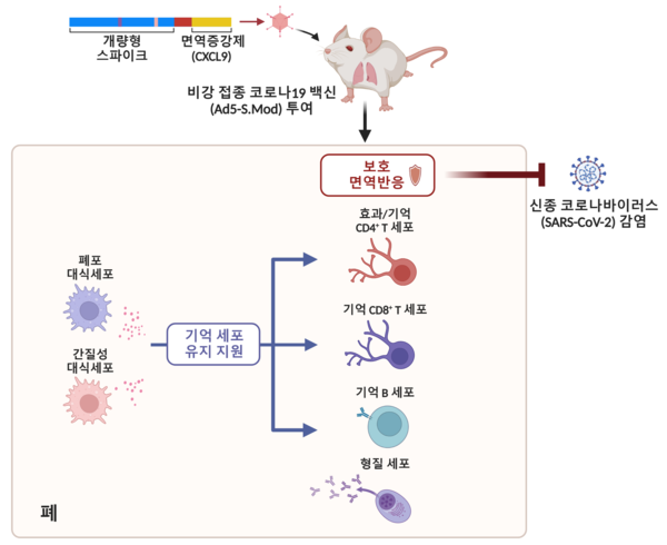 연구진은 아데노바이러스 벡터 플랫폼을 기반으로 개량된 스파이크 단백질 항원과 인간 유래 면역증강제(CXCL9)를 탑재한 비강 접종 코로나19 백신(Ad5-S.Mod)을 개발했다.
