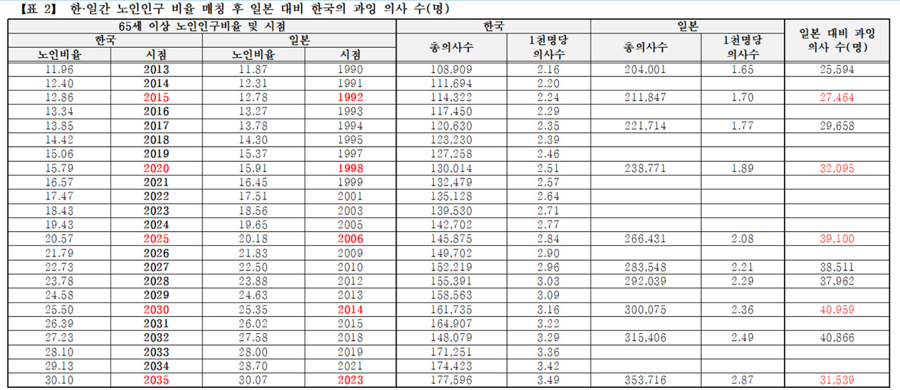 일본이 1998년 인구 고령화율 15.91%에 도달한 시점 인구 1,000명당 의사 수는 1.89명이었다. 한국이 비슷하게 고령화율 15.79%를 기록한 2020년 인구 1,000명당 의사 수는 2.51명이었다. 의정연은 이를 바탕으로 계산하면 한국은 일본 대비 과잉 의사 수가 3만2,095명에 이른다고 했다.