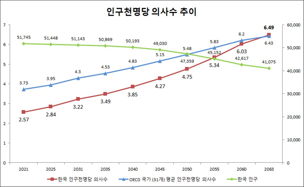 OECD 보건통계에 따르면 2021년 기준 한국 인구 1,000명당 의사 수는 2.57명으로 OECD 국가 평균 3.73명보다 1.16명 적다. 그러나 오는 2040년에는 3.85명으로 늘어나 OECD 평균(4.83명)과 격차가 1명 미만으로 좁혀진다. 의정연은 오는 2063년이면 한국 인구 1,000명당 의사 수가 6.49명으로 OECD 국가 평균 6.43명을 넘어선다고 예측했다.