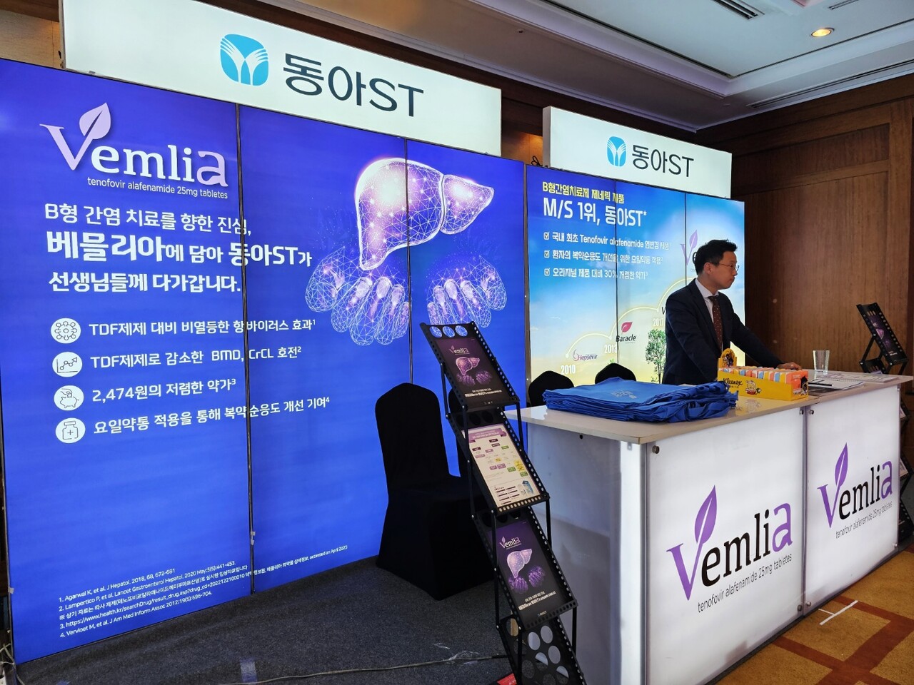 한미약품은 넥사바 퍼스트제네릭인 ‘소라닙정(성분명 소라페닙토실레이트)’을 전면에 내세웠으며, 동아ST와 삼일제약은 각각 올해 초 출시한 베믈리디 후발약 ‘베믈리아(성분명 테노포비르 알라페나미드 시트르산염)’와 ‘베믈리노(성분명 테노포비르 알라페나미드 헤미말산염)’를 소개했다.