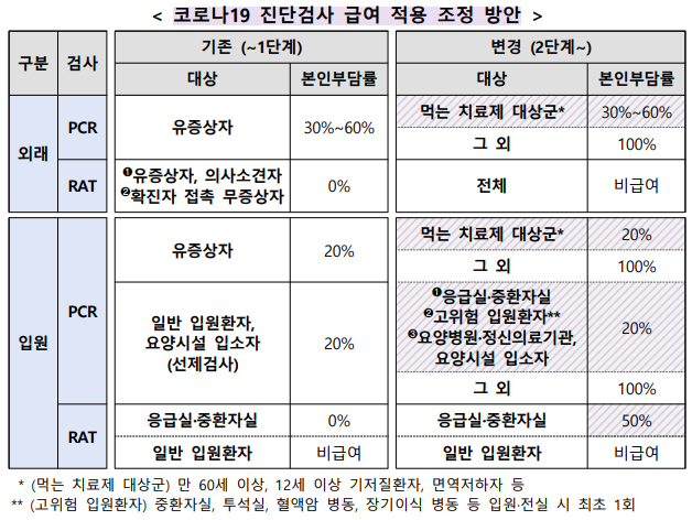 진단·검사와 관련해 PCR·RAT 대상 및 본인부담률도 변경되며 보호자·간병인 대상 선제검사 건강보험 적용도 종료한다.