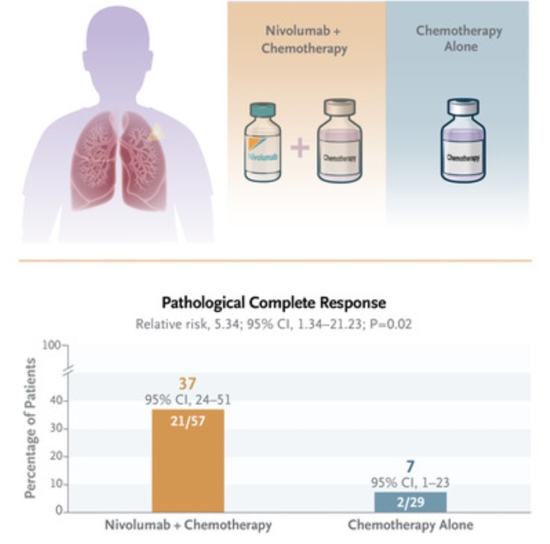 옵디보 투여군의 37%와 대조군의 7%에서 pCR이 나타났으며(상대위험도 5.34), 옵디보 투여군에서는 93%, 대조군에서는 69%의 환자가 수술을 받은 것으로 나타났다(상대 위험도 1.35).