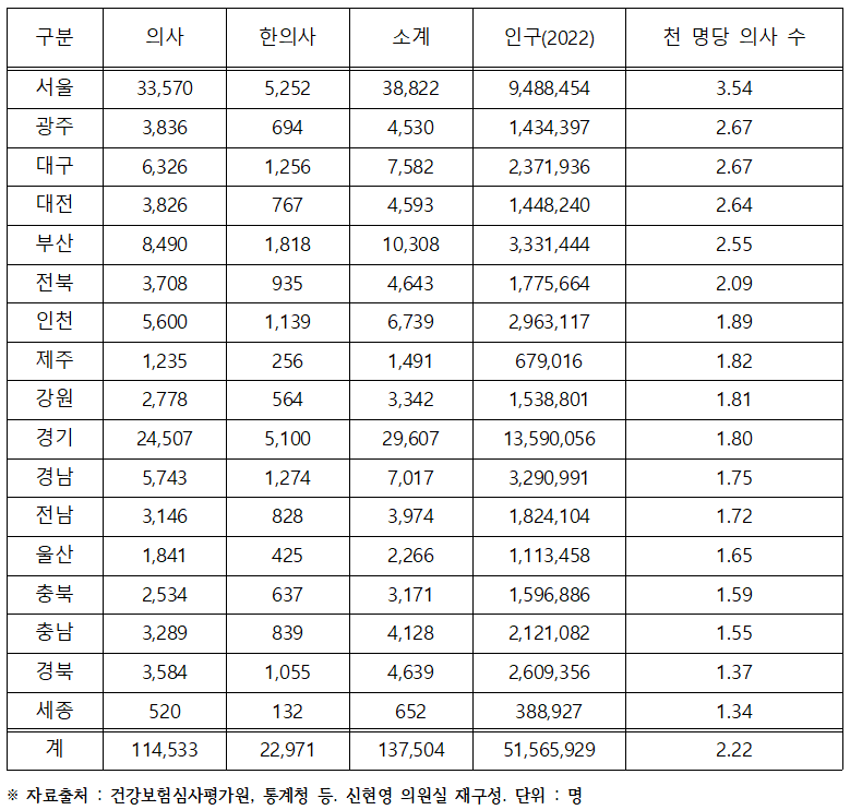 더불어민주당 신현영 의원은 건강보험심사평가원 등으로부터 제출받은 ‘2023년 2분기 지역별 의사‧한의사 인력 현황 자료’를 분석해 공개했다.