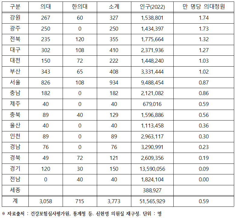 한의대 미포함 시 인구 1만명당 우리나라 의대 정원은 ▲강원이 1.74명으로 가장 많았고 ▲광주 1.73명 ▲전북 1.32명 ▲대구 1.27명 ▲대전 1.03명 ▲부산 1.02명 ▲서울 0.87명 ▲충남 0.86명 순이었다. 제주는 0.59명으로 전국 평균과 같았고 이 외 지역은 전국 평균보다 적었다. 전남은 유일하게 의대 정원이 0명이고 ▲경기 0.09명 ▲경북 0.19명 ▲경남 0.23명 ▲인천 0.30명 순이었다.