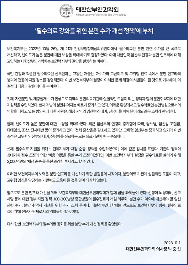 산부인과학회 박중신 이사장(서울대병원)은 지난 1일 입장문을 내고 이번 분만 수가 인상 결정이 “저출산, 저수가와 고난도·고위험 진료 속에서 분만 인프라 붕괴와 전공의 지원 감소”를 해결할 “시발점이 될 것으로 기대한다”며 이같이 말했다.