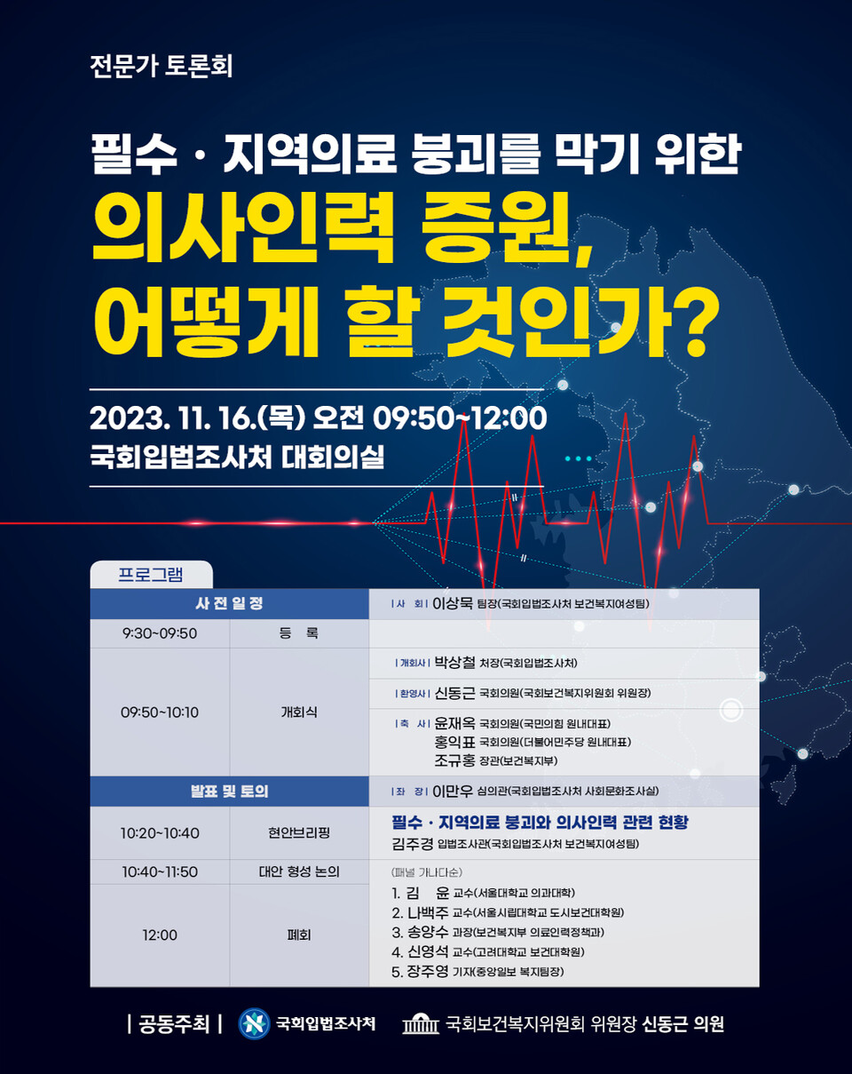 국회입법조사처는 오는 16일 ‘필수‧지역의료 붕괴를 막는 의사인력 증원, 어떻게 할 것인가’를 주제로 전문가 토론회를 개최한다.