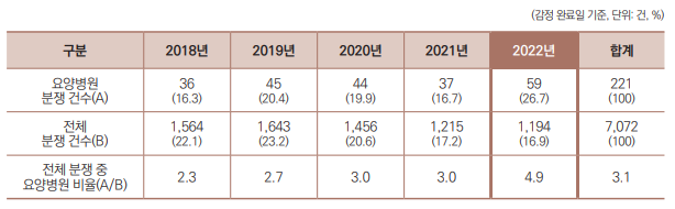 특히 전체 분쟁 건수는 2018년 15,64건에서 2022년 1,194건으로 줄었지만 요양병원은 36건에서 59건으로 늘었다.