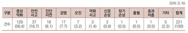 사고내용별 현황을 보면 ▲증상악화 129건(58.4%) ▲안전사고 37건(16.7%) ▲진단지연 18건(8.1%) ▲감염 17건(7.7%) ▲오진 7건(3.2%)이었다.