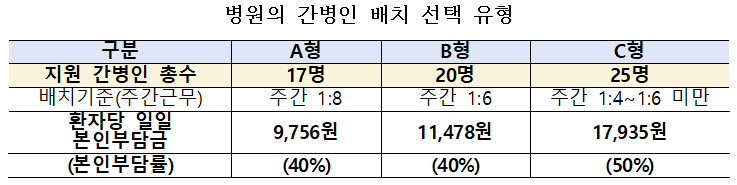 병원이 선택한 간병인 배치 유형(A형, B형, C형)별로 병원당 17명에서 25명의 간병인력 인건비와 관리‧운영비를 지원한다.