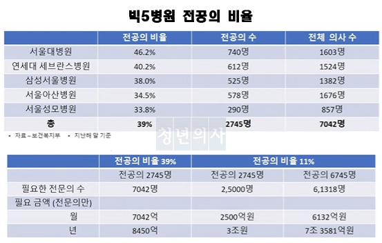 빅5병원 전공의 비율을 11%로 낮추려면 전문의를 7,042명에서 3.6배인 2만5,000명으로 늘려야 한다. 1만7,958명 더 채용해야 한다는 의미다. 전문의 1인당 월급을 평균 1,000만원으로 책정하면 한 달 인건비는 2,500억원이고 연간 최소 3조원이 필요하다. 이는 전공의가 2,745명일 때다.