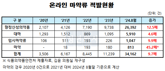 국회 보건복지위원회 소속 더불어민주당 김윤 의원은 25일 식품의약품안전처 자료를 분석한 결과, 마약류 온라인 판매 광고 적발 건수가 지난 2020년 3,506건이었지만 2024년 8월 기준 9.7배인 3만4,162건으로 늘었다고 25일 밝혔다