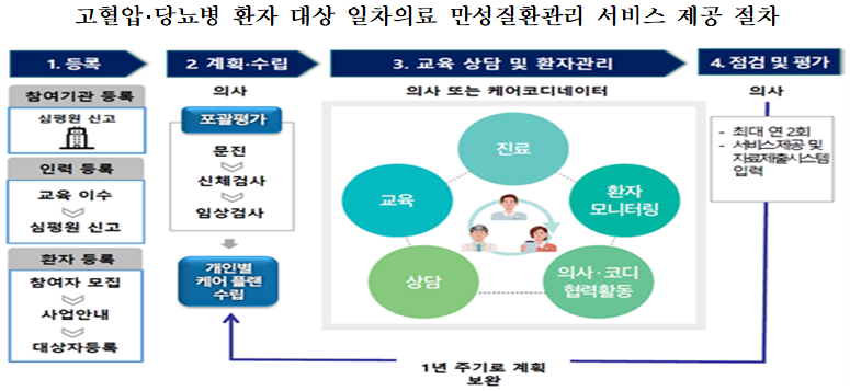 고혈압‧당뇨병 환자는 가까운 동네의원에서 검사를 통해 환자 맞춤형 관리계획을 세우고 질병에 관한 교육‧상담과 생활 습관 개선 등을 위한 다양한 환자 관리 서비스를 1년 주기로 받을 수 있다.