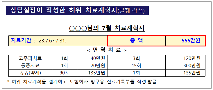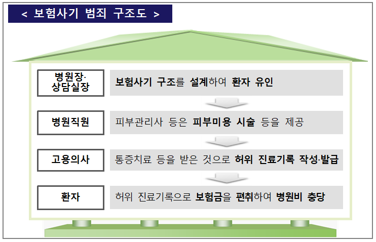 조사결과 병원장과 상담실장은 환자들에게 입원을 권유하면서 가입된 보험상품의 보장한도에 맞춰 통증치료 등의 진료기록을 발급해주고 실제로는 미용시술 등을 제공할 수 있다고 현혹했다.