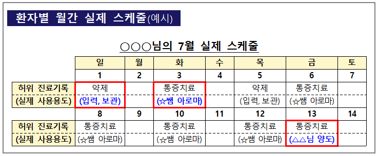 예를 들어 일자별 허위 진료계획 하단 괄호 안에 표기된 “☆쌤”은 특정 피부관리사를 지칭하는 것이며 “보관”은 적립 후 추후 사용한다는 의미, “△△님”은 해당 금액을 양도받을 타인을 지칭하는 식이다.