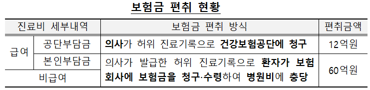 더해 입원비, 식사비 등 급여 항목으로 공단에 12억원을 직접 청구해 부정 수급하는 등 공‧민영 보험금 총 72억원을 편취했다.