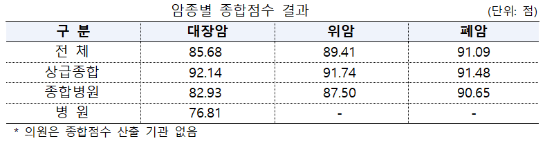 평가결과 종합점수는 대장암 85.68점, 위암 89.41점, 폐암 91.09점이었으며, 특히 상급종합병원이 다른 종별 보다 점수가 높았다.