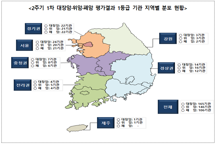1등급 기관 비율은 대장암은 56.4%, 위암은 74.0%, 폐암은 80.7%이었다. 지역별로는 대장암, 위암은 전국 모든 권역에 분포하나 제주에는 폐암 1등급 기관이 없었다.