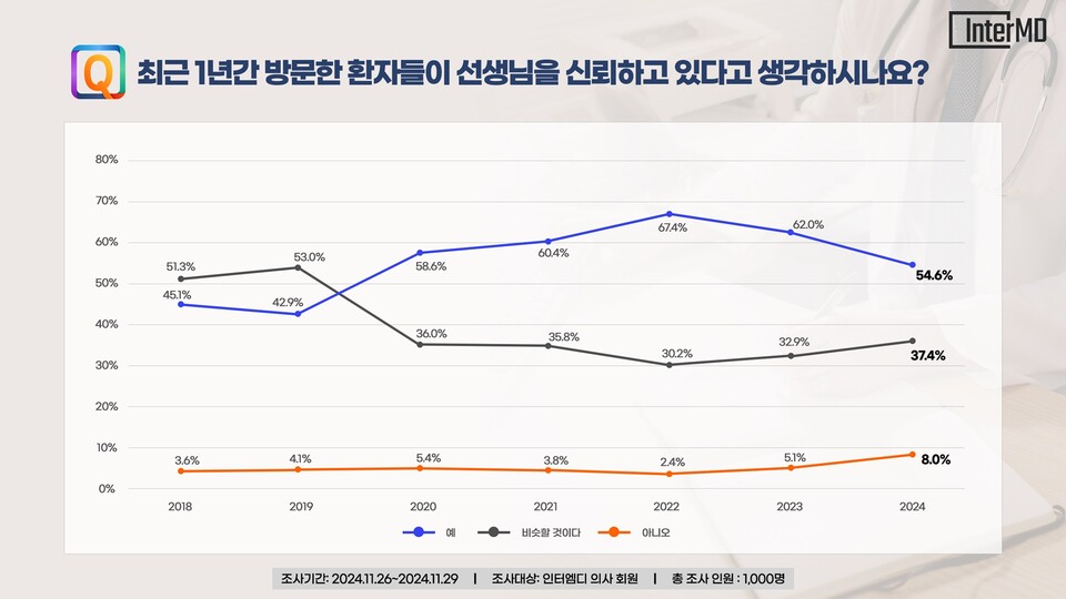 환자가 의사를 신뢰한다고 생각하는 비율은 낮아지고 있다. 최근 1년간 내원한 환자들이 의사를 신뢰하고 있다고 생각하느냐는 질문에 응답자의 54.6%가 그렇다고 답했다. 이는 지난해(62.0%)보다 7.4%P 떨어졌다. 반면 환자가 의사를 신뢰하지 않는다고 생각하는 비율은 2022년 2.4%에서 2023년 5.1%, 2024년 8.0%로 증가세다.