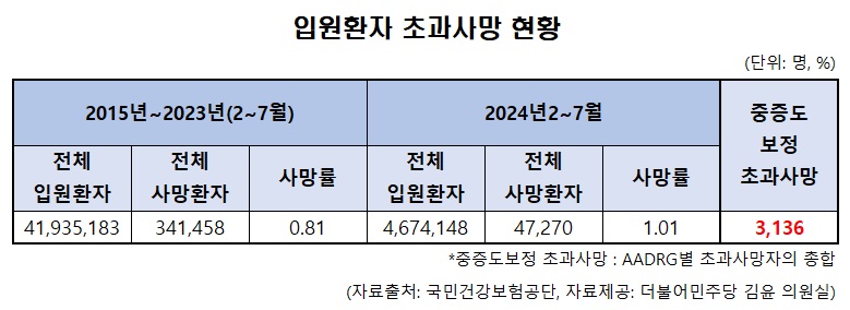 국회 보건복지위원회 소속 더불어민주당 김윤 의원은 5일 국민건강보험공단으로부터 자료를 받아 지난 2015년부터 2024년까지 각 연도별 2월에서 7월 사이 입원환자와 입원결과사망 현황을 분석한 결과, 지난해 2월부터 7월까지 3,136명의 초과사망이 발생했다고 밝혔다.