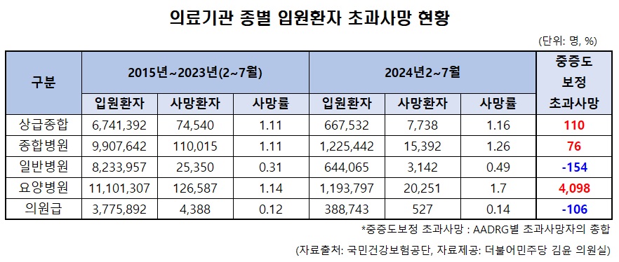 김 의원은 환자 연령과 질병군 특성에 따른 환자분류체계인 AADRG(Age Adjacent DRG)를 이용해 환자 중증도가 보정된 사망률을 산출하고, 초과사망을 계산했다고 설명했다. 중증도 보정 초과사망은 과거 사망률 데이터를 올해 입원환자에 곱해 올해 발생할 예상 사망자 수를 계산하고, 이를 실제 발생한 사망자 수와 비교해 도출했다.