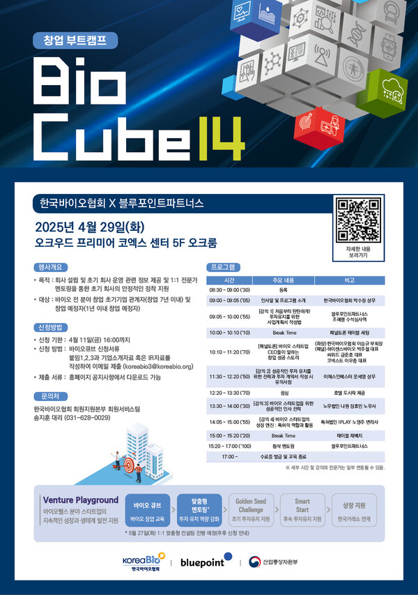 한국바이오협회가 블루포인트파트너스와 함께 오는 4월 29일 ‘제14회 바이오큐브 창업 부트캠프(BioCube)’를 개최한다.