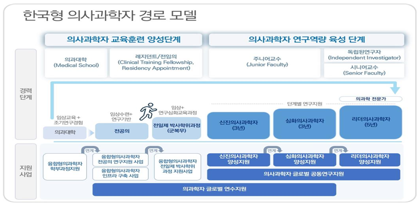 정부는 의사과학자 배출 수준을 연간 의대 졸업생의 1.6%에서 선진국 수준인 3%로 확대하는 것을 목표로 ▲학부부터 석‧박사, 박사 후 연구 성장지원 ▲글로벌 공동연구지원 등 보건의료분야 특화 융‧복합 혁신인재를 양성하기 위해 단계적으로 지원한다.
