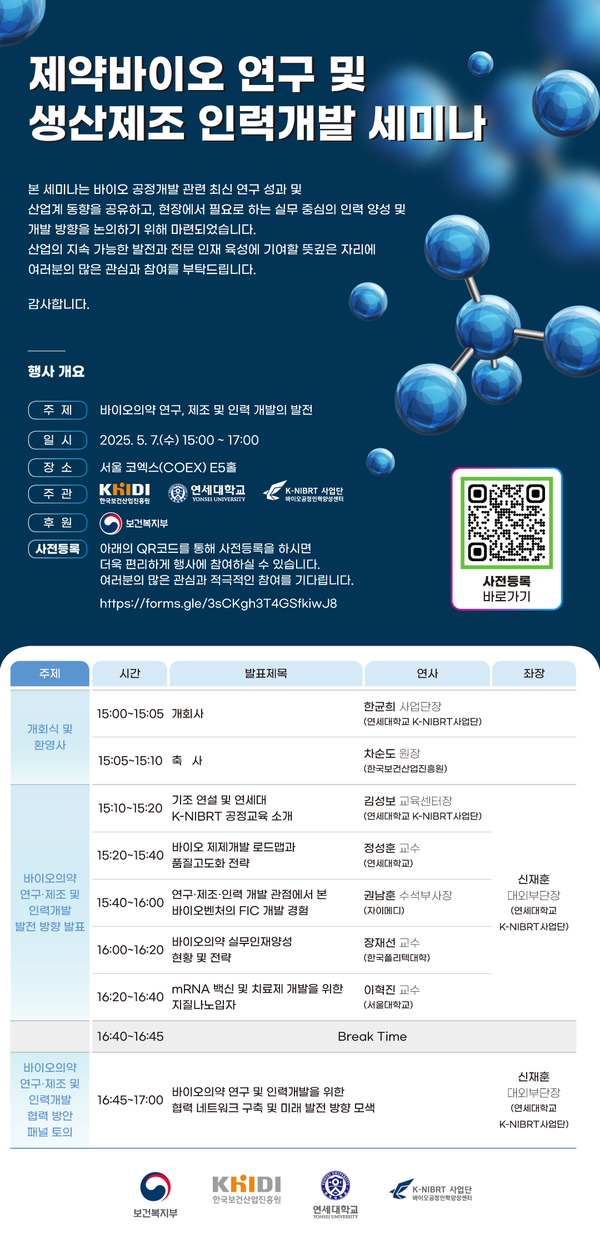 세미나는 바이오 공정개발과 생산기술 분야의 최신 연구 성과와 산업계 수요를 공유하고, 변화하는 글로벌 시장 환경에 대응할 수 있는 산업현장의 실무인력 양성 방안을 심도 있게 논의하는 자리로 마련됐다. 세미나는 진흥원과 연세대 K-NIBRT사업단이 공동주관한다.