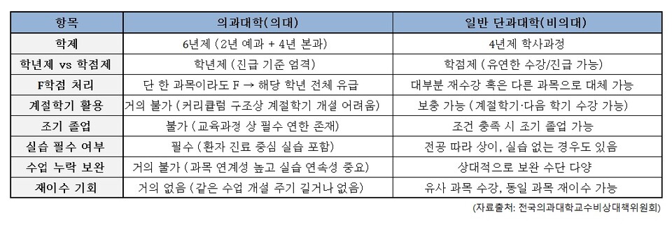전의비는 “의대는 학년제가 적용돼 단 한 과목이라도 낙제(F학점)를 받을 경우 전체 학년을 유급해야 하며 이를 보완할 수 있는 계절 학기나 재이수 제도는 존재하지 않는다”며 의대 학사 과정이 다른 단과대와 다르다고 설명했다.